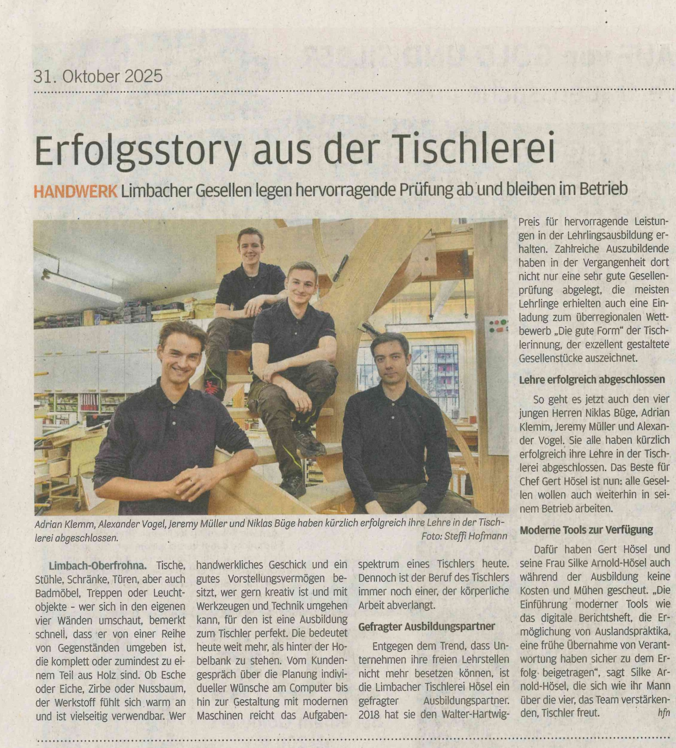 Nachwuchstischlerin der Tischlerei Hösel belegt ersten Platz